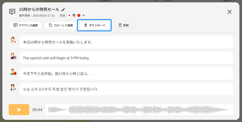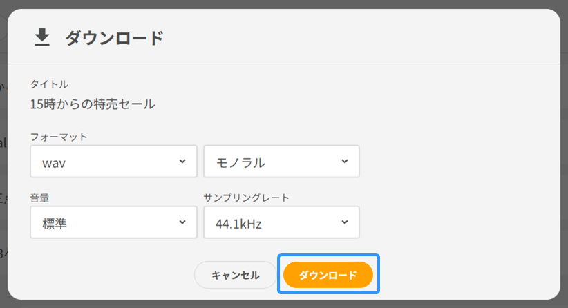 作成したアナウンスはmp3やwavファイルとしてダウンロードすることができます。以下がダウンロードファイルの仕様です。