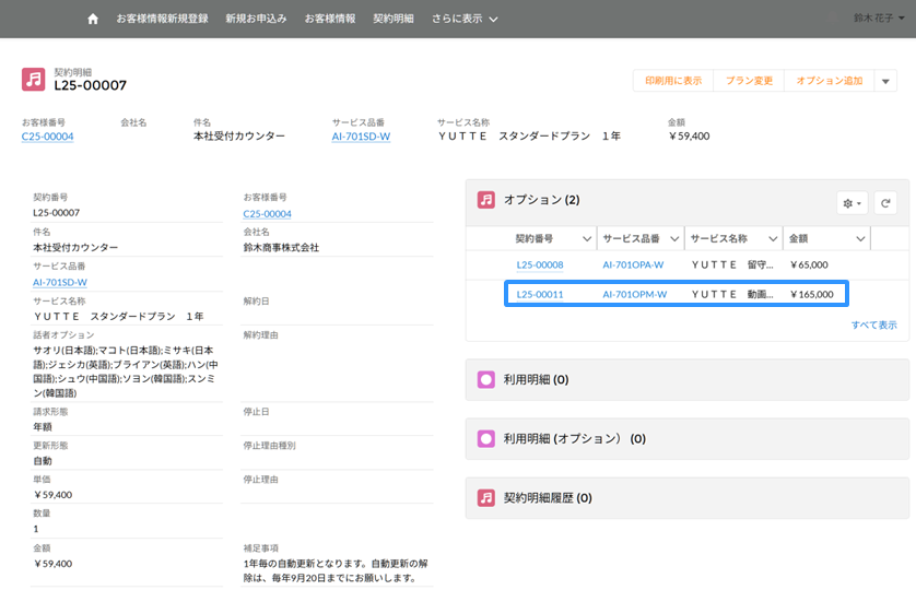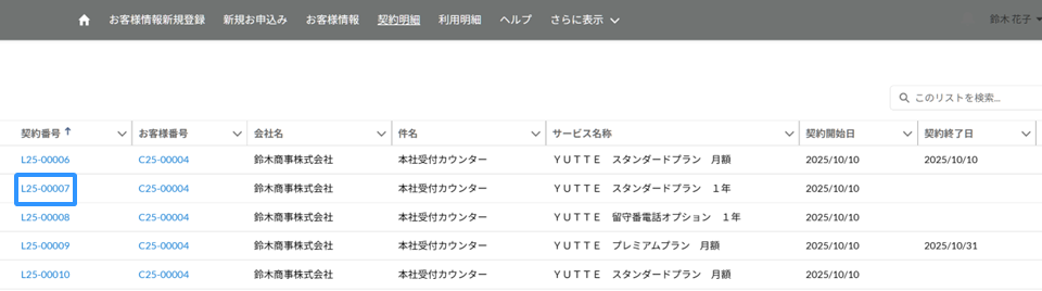 契約明細より、オプションを追加したい契約明細の番号をクリックしてください。