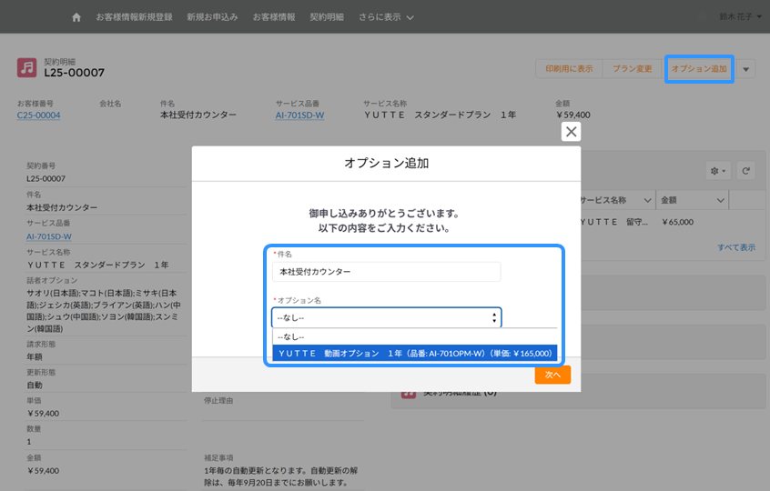 契約内容の詳細が表示されましたら、オプション追加をクリックしてください