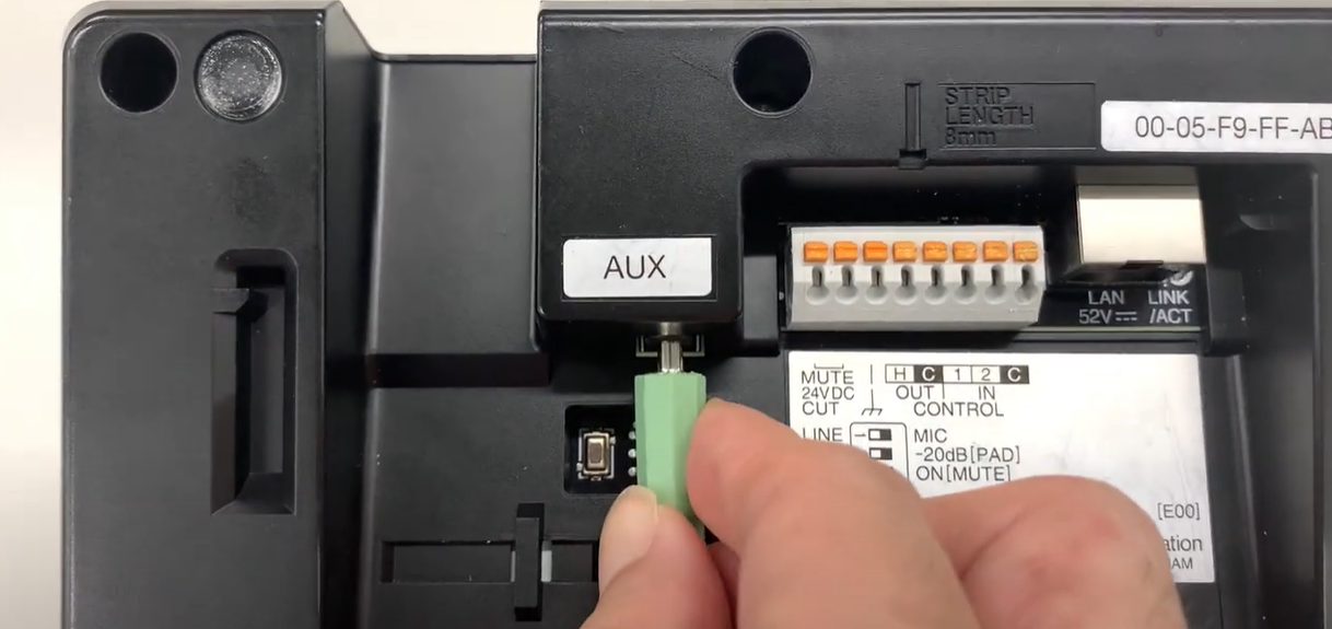 IPリモートマイクのAUX端子にオーディオケーブルを接続し、もう一方をPCやスマートフォンなど音源再生機器に接続します。