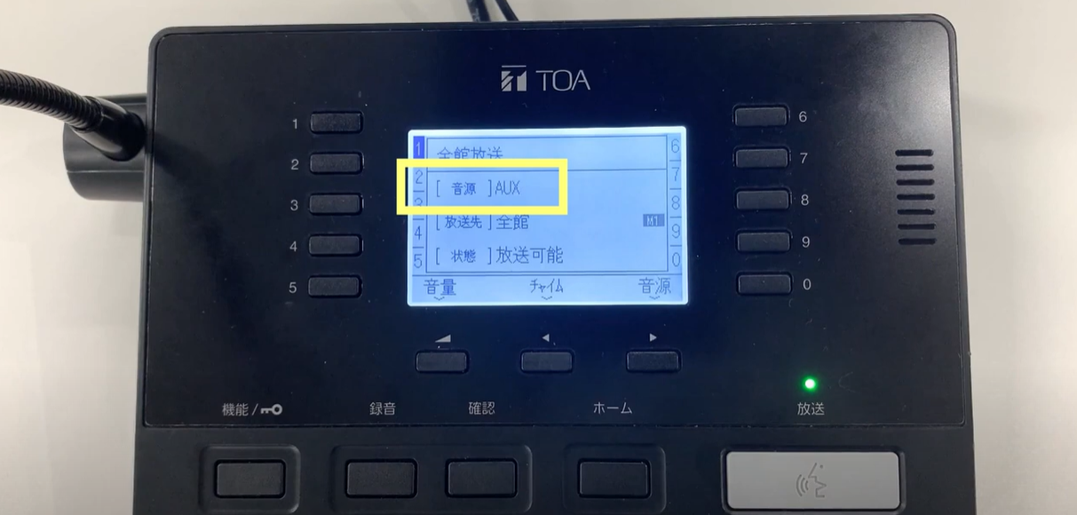 音源ボタンを押して、音源が AUX に切り替わるようにします。