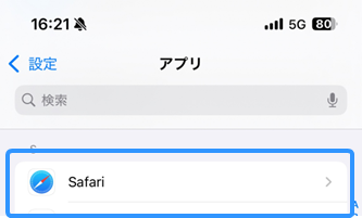 - 設定アプリを開いて、「アプリ」→「Safari」を選択