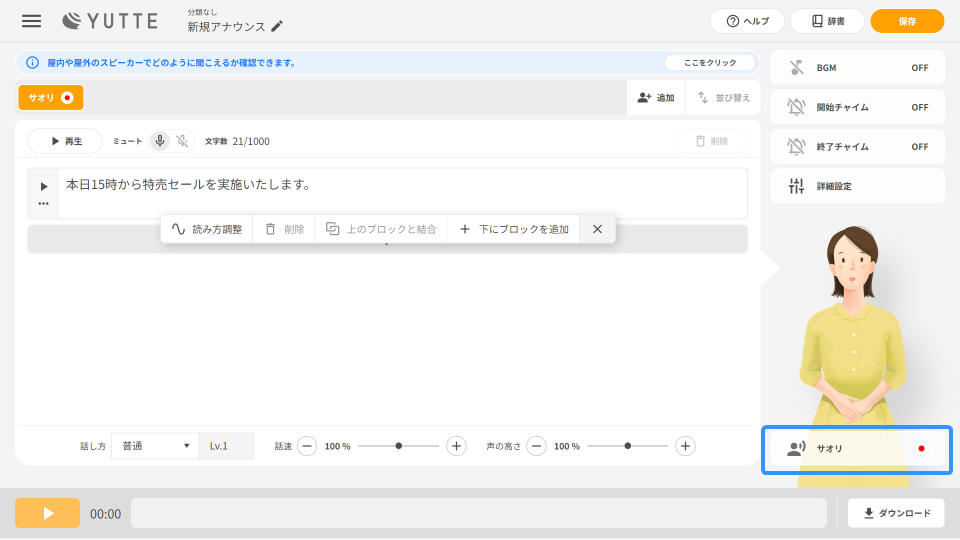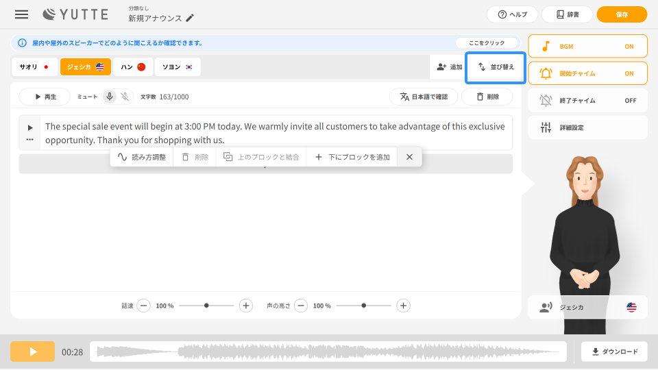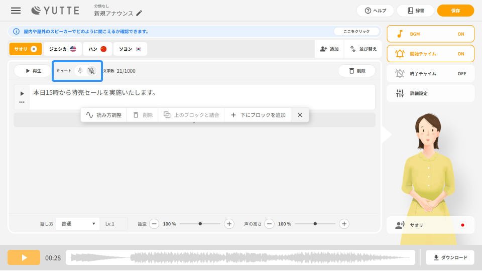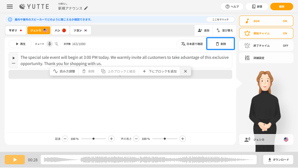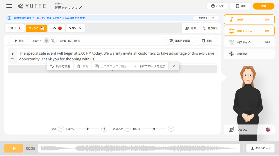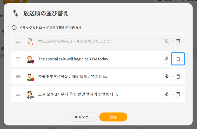 1つのアナウンスに複数の話者を設定することで、同じ言語での掛け合いや多言語を組み合わせた音源を作成できます。