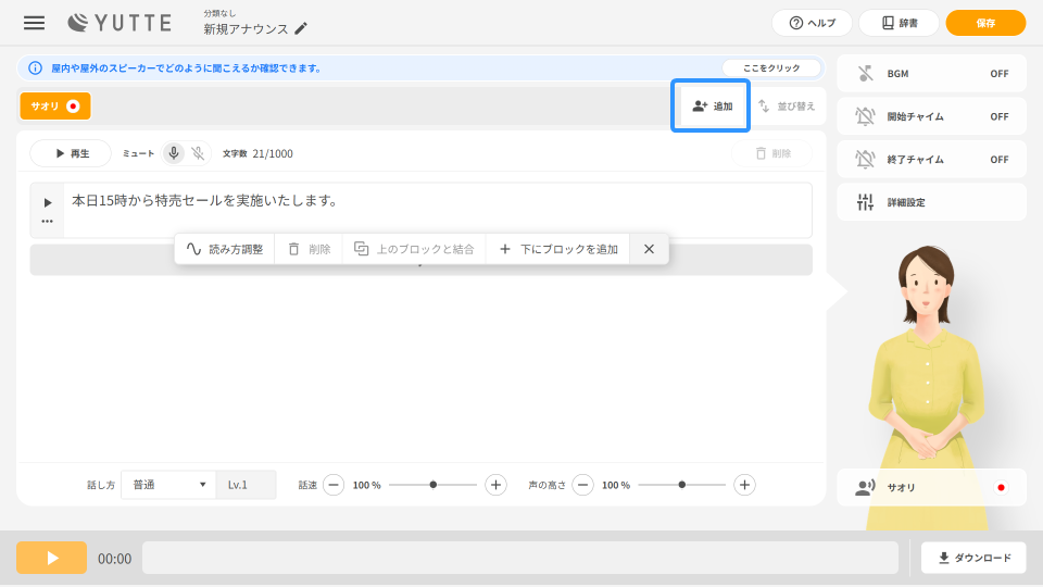 追加したい話者を選択し決定ボタンを押すと、編集画面に話者が追加されます。