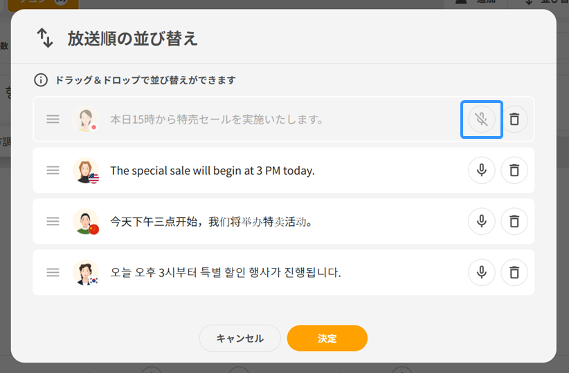 並び替え画面からも話者のミュート設定を切り替えることができます。