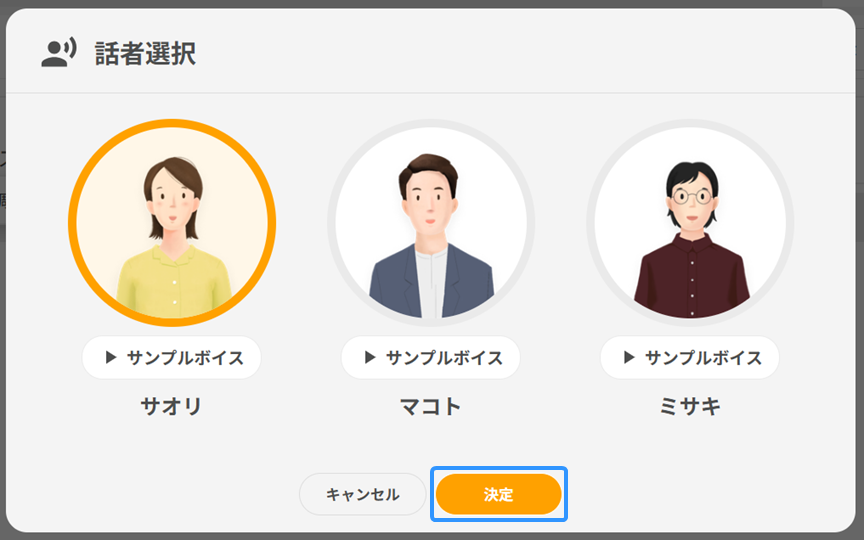 変更したい話者を選択し決定ボタンを押すと、編集画面の話者が変更されます。