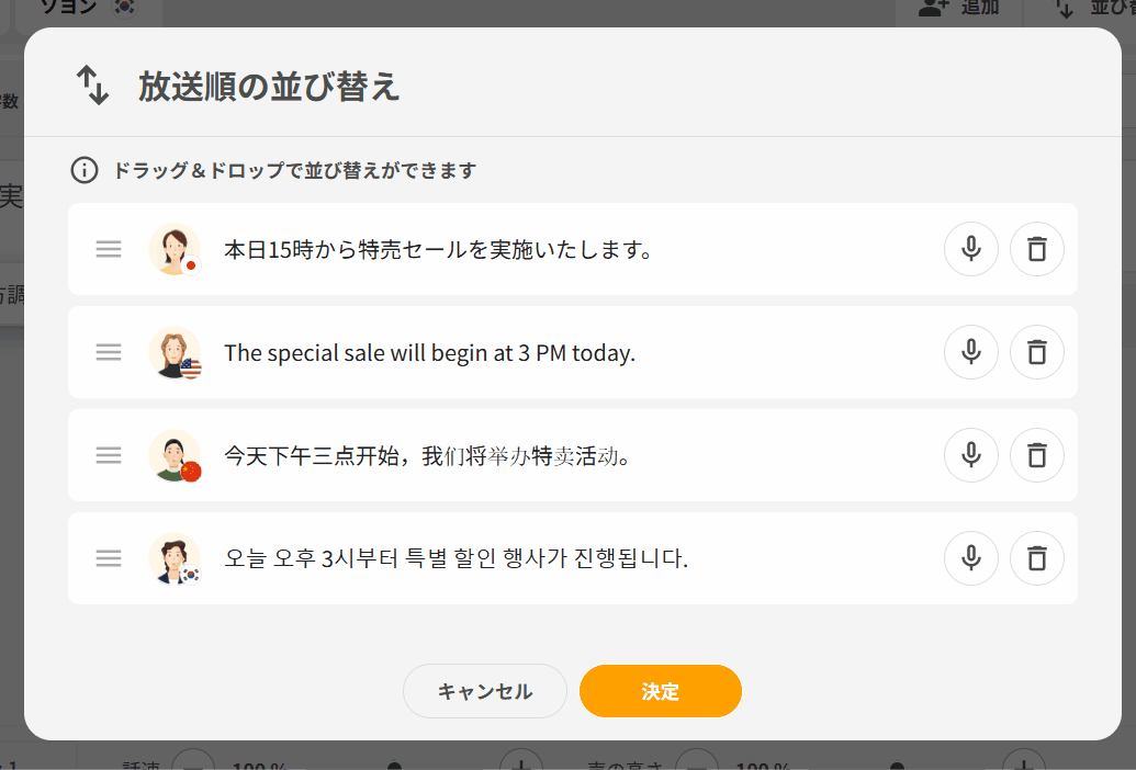 話者はドラッグ&ドロップで並び替えることができます。完了後は決定ボタンを押してください。
