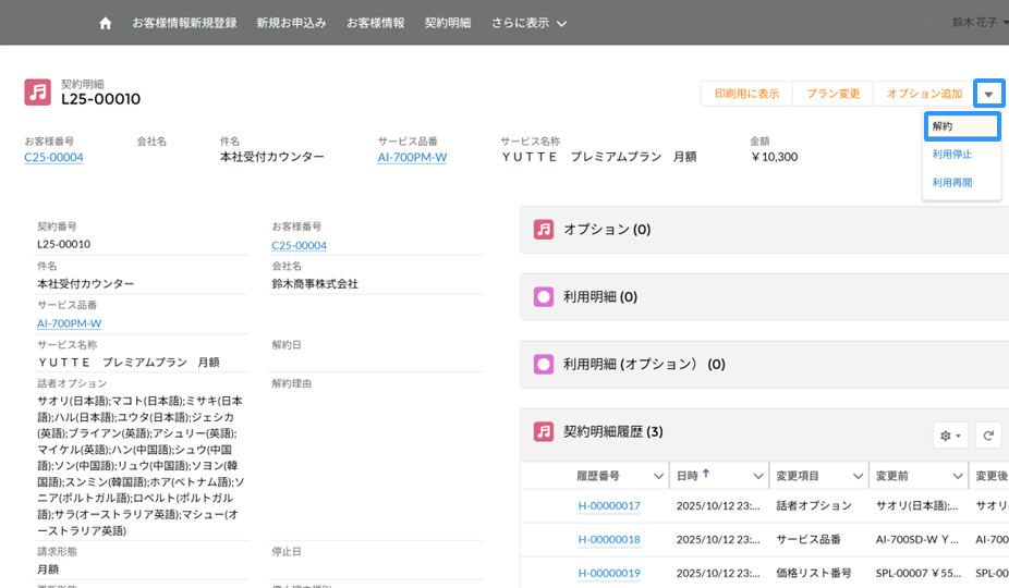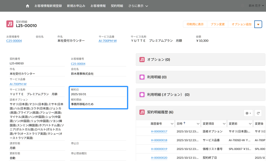 プランの解約状況は、契約内容の詳細画面にて、解約日・解約理由にてご確認いただけます。
