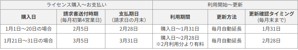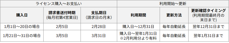 - 毎月21日~月末までのお申込みの場合 月末までの期間を無料とし、翌々月第4営業日に1年分の請求書を送付いたします。お支払い期日は請求日の月末となります。