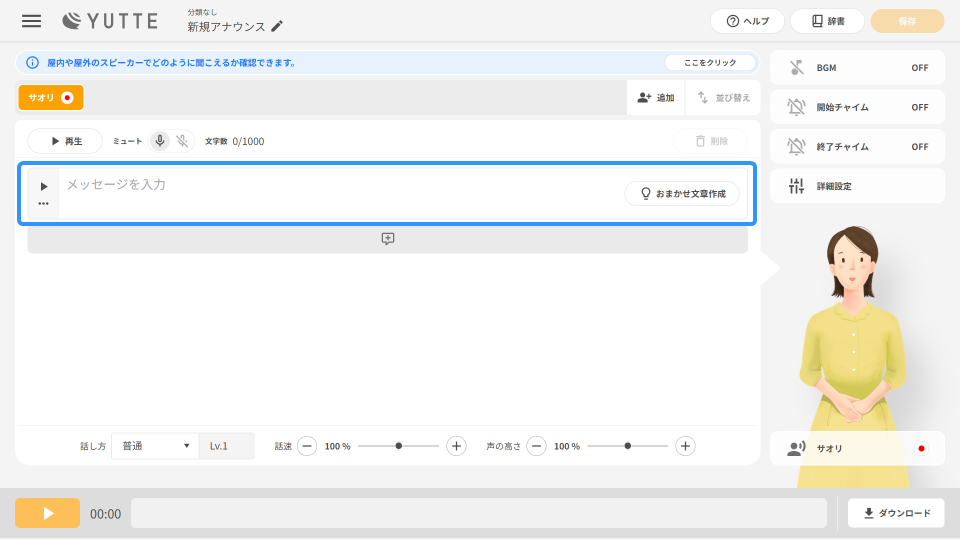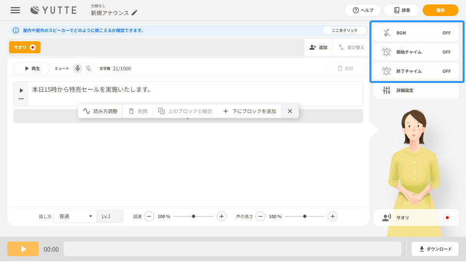 アナウンスにチャイムやBGMを設定したいときは、ここから設定できます。
