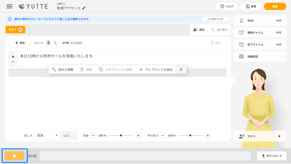 作成した音源は左下の再生ボタンを押すと聞くことができます。