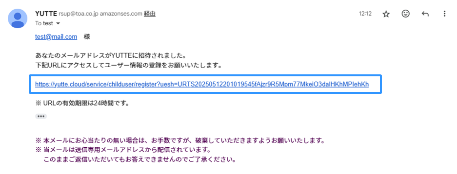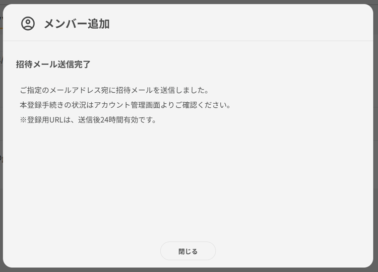 招待URLの有効期限は24時間です。有効期限が切れてしまったときには、再度招待メールを送信してもらってください。