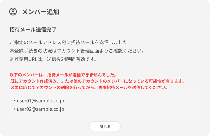 以下のようなエラーが表示された場合は、対象の方がすでに登録済みである可能性があります。 登録済みの方は再度追加できませんので該当の方に状況をご確認いただき、必要に応じて削除後に再度追加をお試しください。