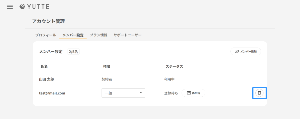 メンバー設定の画面でゴミ箱ボタンを押すと、対象のメンバーを削除します。