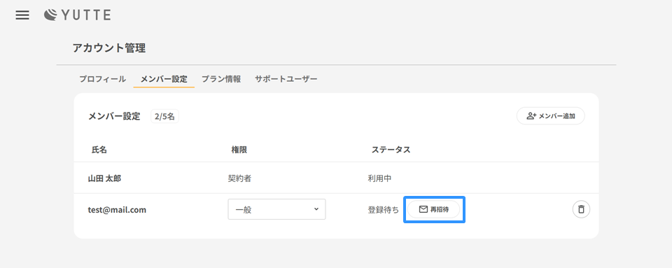 メンバーの登録状態は一覧画面のステータスで確認することができます。招待された方が招待メールを誤って破棄してしまったり、招待メールの有効期限が切れてしまったときには、再招待ボタンを押してください。再度招待メールを送信します。
